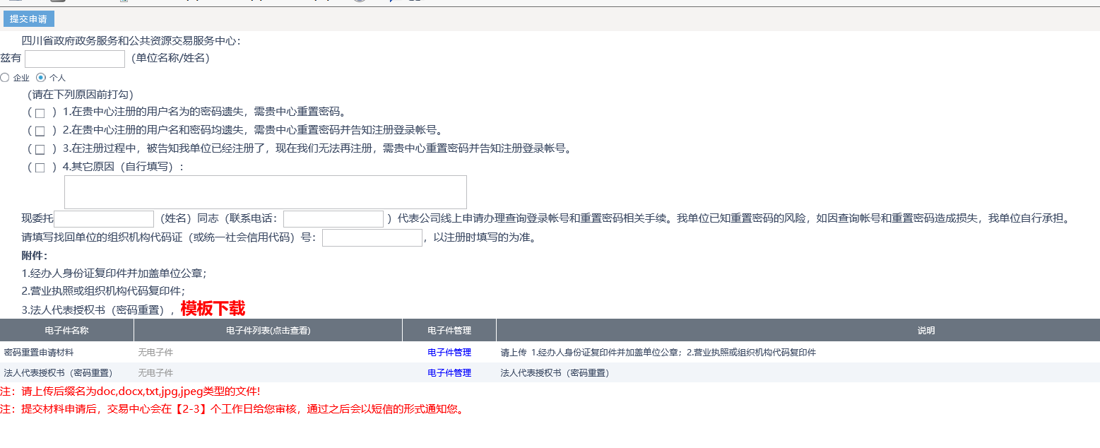 2、填寫(xiě)相關(guān)資料,點(diǎn)擊【提交申請(qǐng)】按鈕提交審核。如需加急處理,請(qǐng)聯(lián)系交易中心,審核通過(guò)后,在您預(yù)留的手機(jī)號(hào)碼上會(huì)收到短信通知,短信上會(huì)告知賬號(hào)和密碼。電話:028-12345
