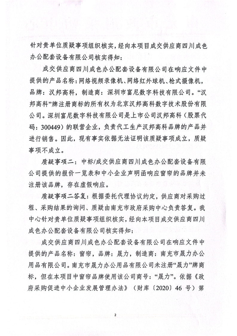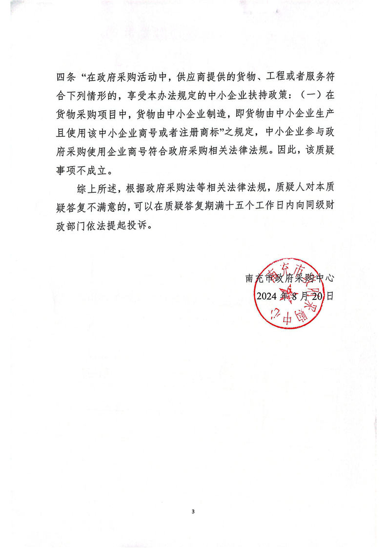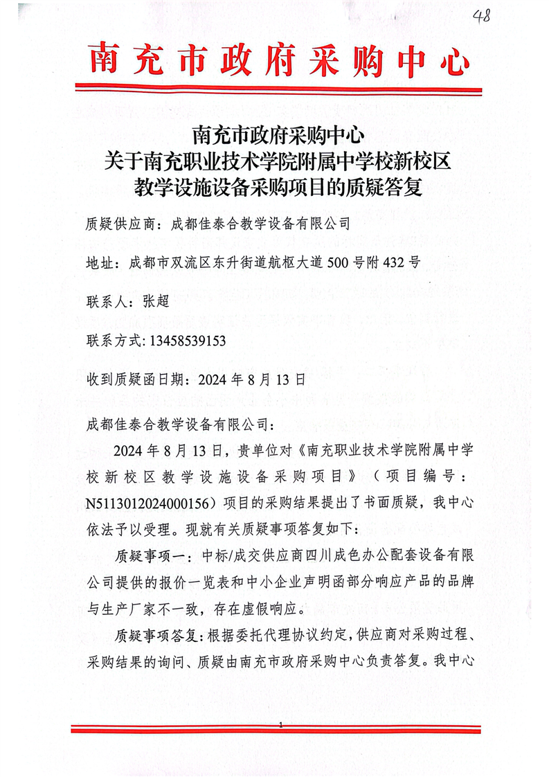 南充市政府采購中心關(guān)于南充職業(yè)技術(shù)學(xué)院附屬中學(xué)校新校區(qū)教學(xué)設(shè)施設(shè)備采購項目的質(zhì)疑答復(fù)(成都佳泰合教學(xué)設(shè)備有限公司)
