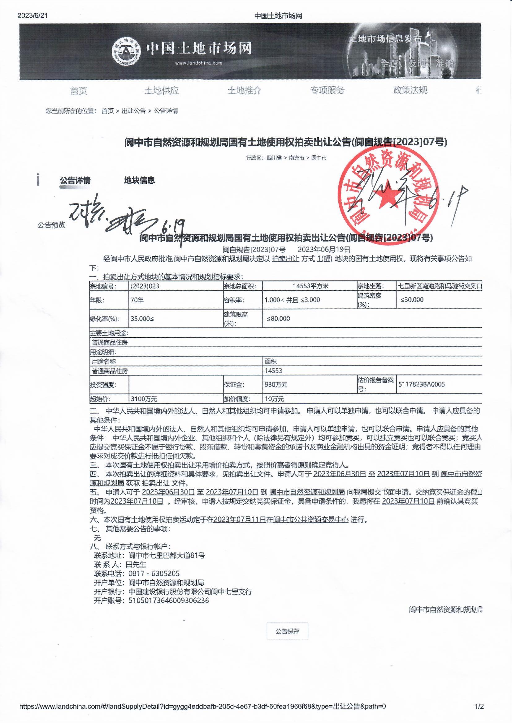 閬中市自然資源和規(guī)劃局國有土地使用權(quán)拍賣出讓公告(閬?zhàn)砸?guī)告[2023]07號(hào))