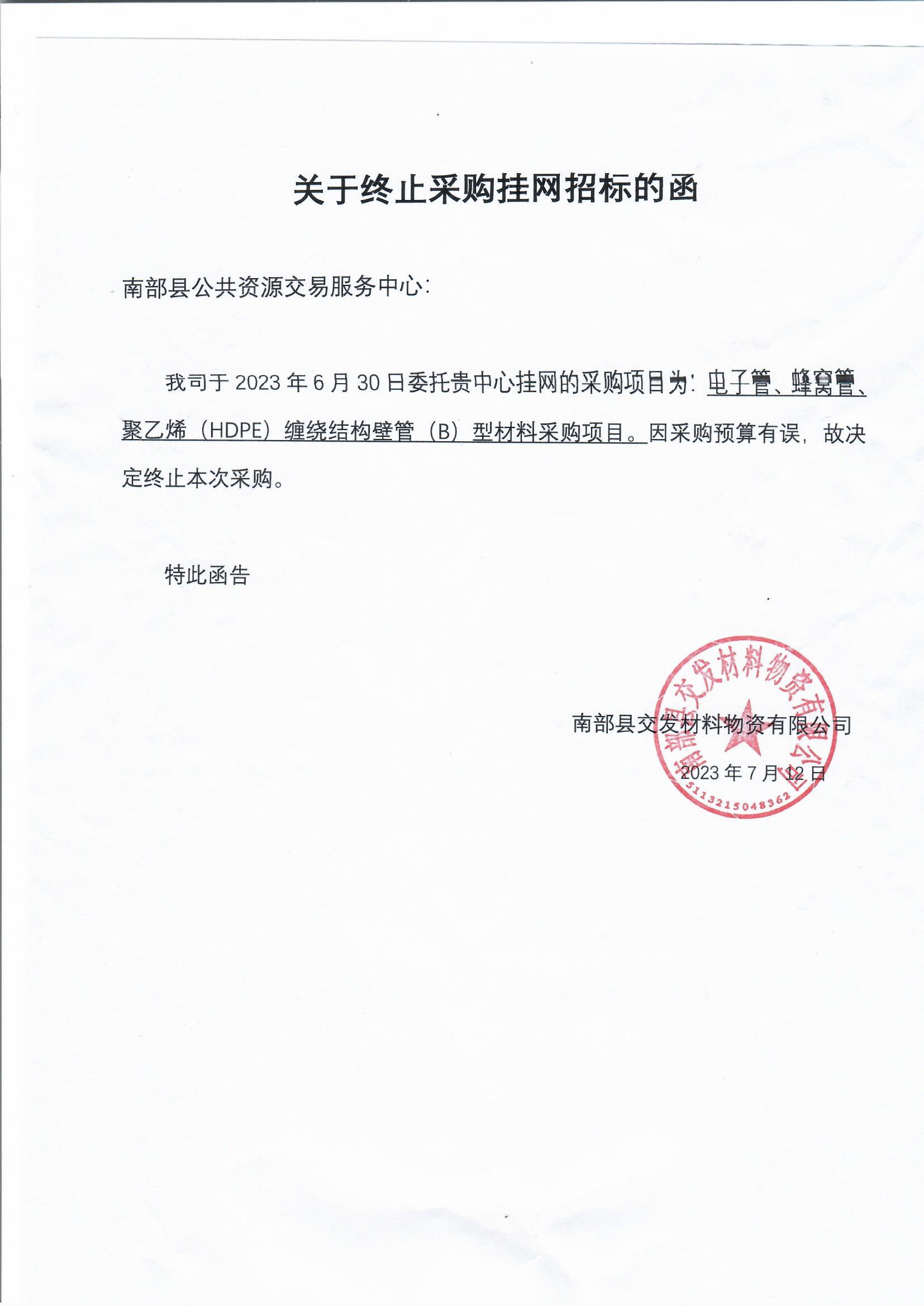 南部縣交發(fā)材料物資有限公司電力管、蜂窩管、聚乙烯(HDPE)纏繞結(jié)構(gòu)壁管(B)型材料采購項目終止公告