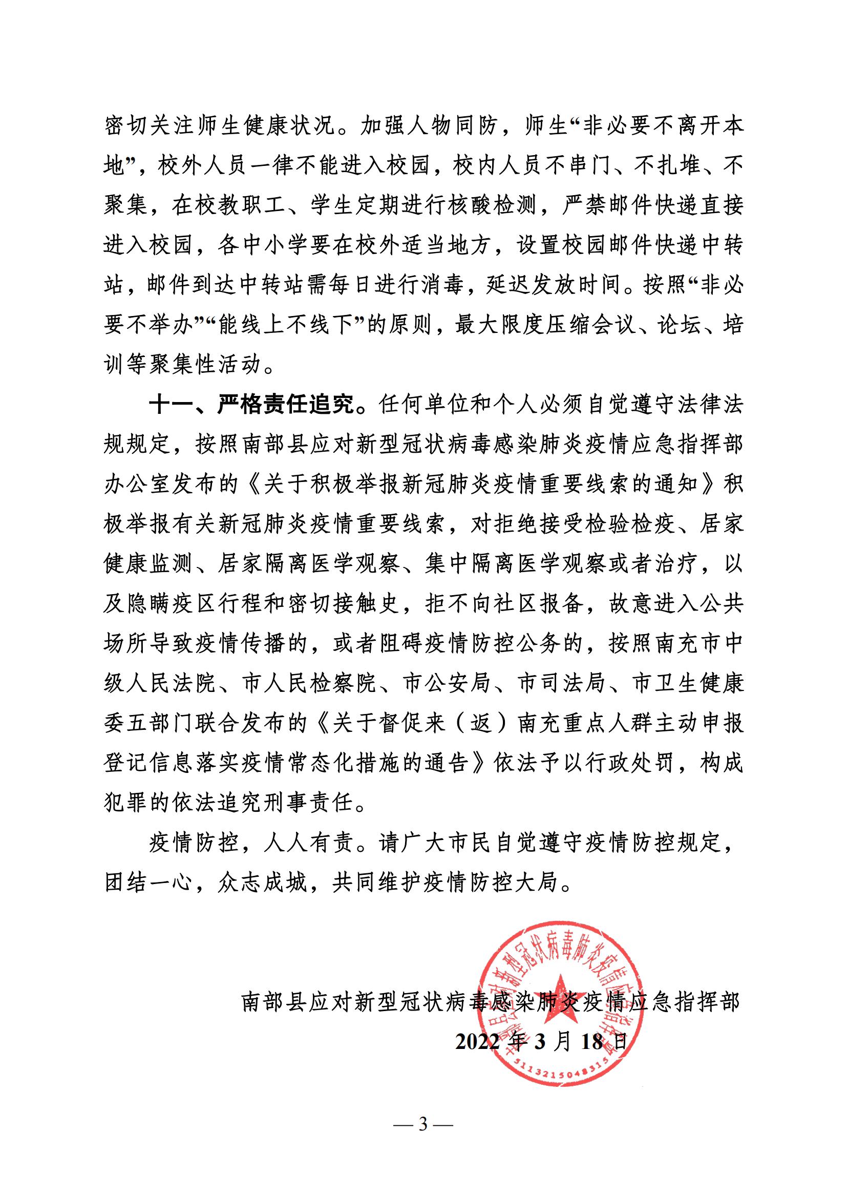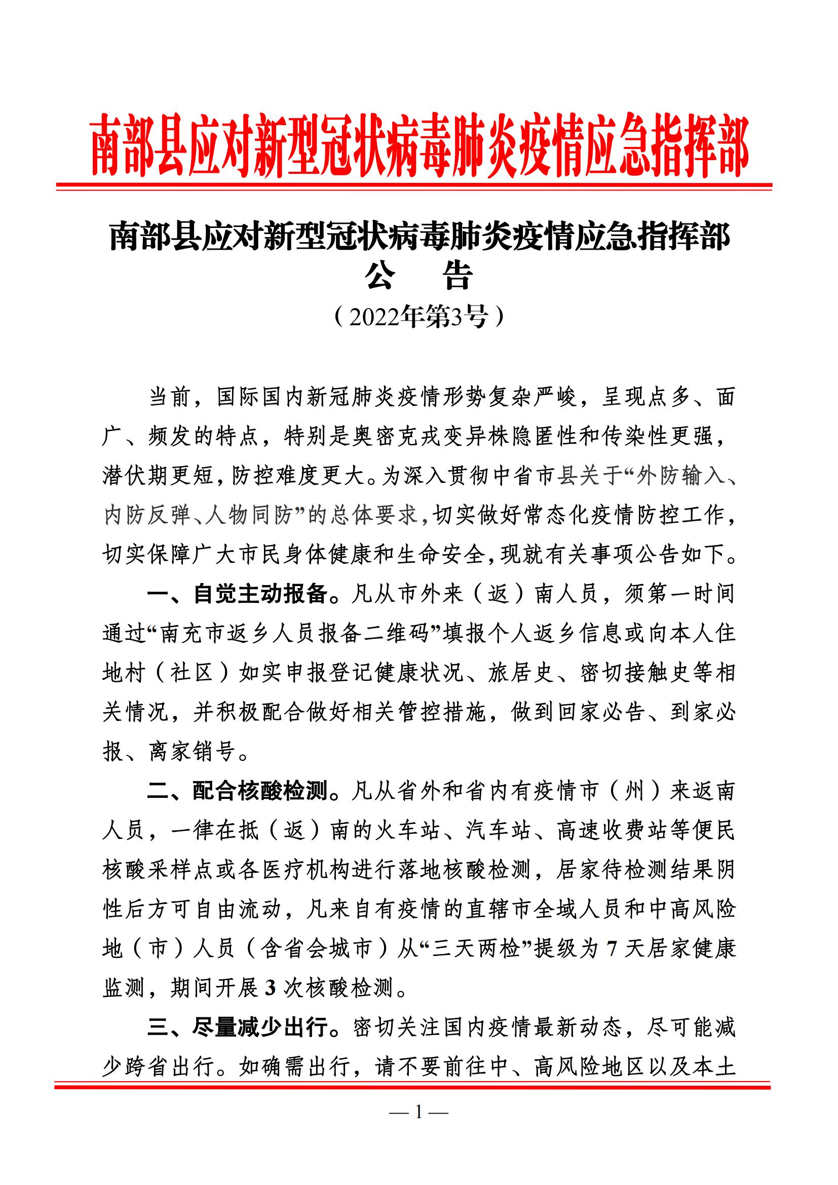 南部縣應(yīng)對(duì)新型冠狀病毒肺炎疫情應(yīng)急指揮部公告(2022年第3號(hào))
