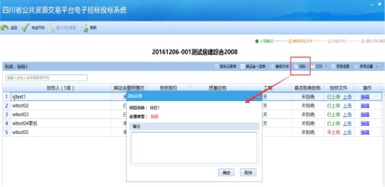 注:如遇特殊情況,需要投標(biāo)人現(xiàn)場遞交投標(biāo)文件,請?jiān)陂_標(biāo)一欄表中選擇該投標(biāo)人,然后上傳文件。