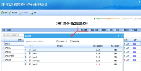 點(diǎn)擊“報(bào)名記錄表”,可以查看當(dāng)前標(biāo)段有哪些投標(biāo)人參與了報(bào)名,這里上傳投標(biāo)文件的會(huì)默認(rèn)加入到“開標(biāo)記錄表”中,其他投標(biāo)人如果需要加入,請?jiān)谠撏稑?biāo)人前面打鉤,然后點(diǎn)擊“加入到開標(biāo)記錄表”;