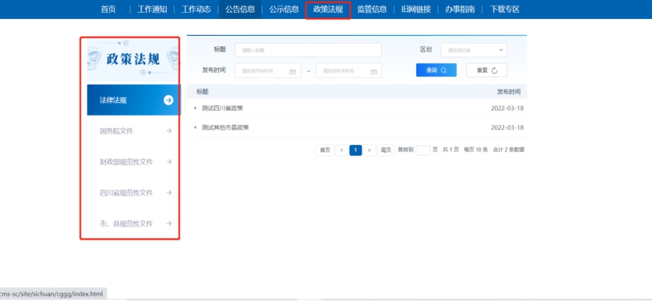 展示對應(yīng)的政策法規(guī)有法律、行政法規(guī)、國務(wù)院文件、四川省政府采購規(guī)范文件和其他市縣規(guī)范性文件等,點(diǎn)擊對應(yīng)的標(biāo)題進(jìn)入詳情頁,如下圖所示: