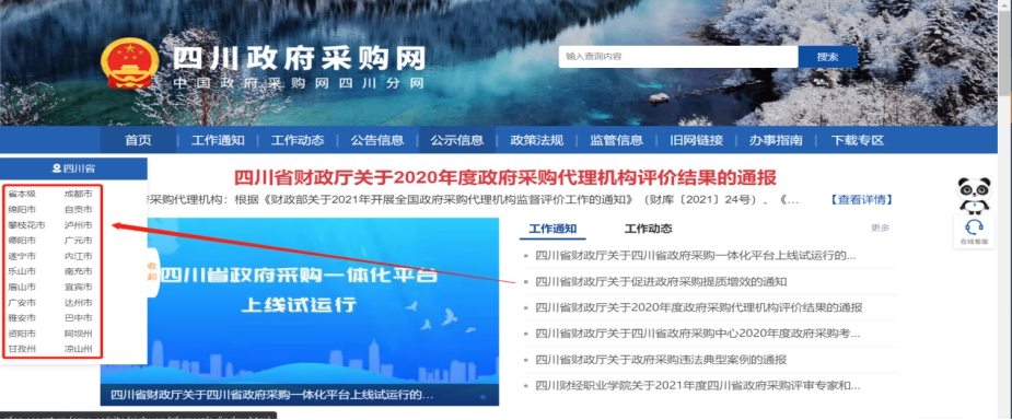 在首頁左邊的彈框中可以點(diǎn)擊四川省各個地州直接查看各個地州的公告信息,如下圖所示:
