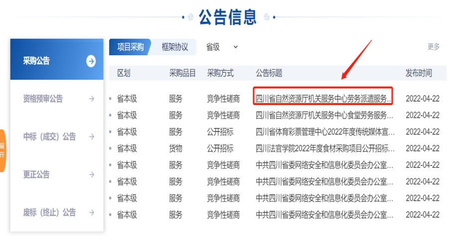 選擇其中任意一項(xiàng),右側(cè)顯示采購品目、采購方式、采購標(biāo)題和發(fā)布時間等內(nèi)容。如下圖所示,點(diǎn)擊選中的黃色字段即可進(jìn)入公告查看具體內(nèi)容。如下圖所示: