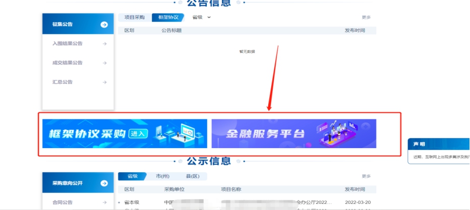 框架協(xié)議公告欄包括:征集公告、入圍結(jié)果公告、成交結(jié)果公告和匯總公告,點(diǎn)擊對應(yīng)的公告內(nèi)容進(jìn)入查看詳細(xì)公告信息。如下圖所示: