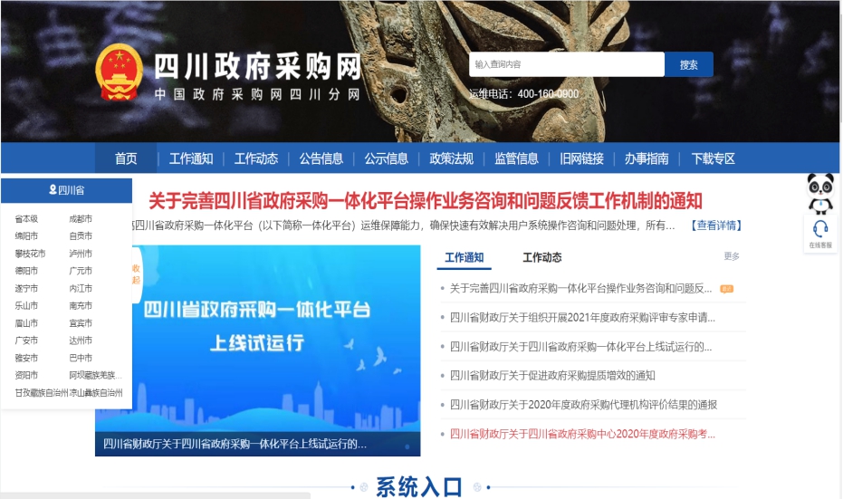 該功能是用戶進(jìn)入四川政府采購網(wǎng),點(diǎn)擊對應(yīng)市州或區(qū)縣后,整個門戶網(wǎng)頁信息將顯示對應(yīng)市州或區(qū)縣相關(guān)工作動態(tài)和公告信息。