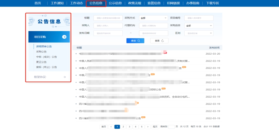 公告信息包括:采購公告、資格預(yù)審公告、中標(biāo)(成交)公告、更正公告和成標(biāo)(終止)公告。如下圖所示:
