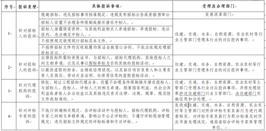 各招投標(biāo)行政監(jiān)督部門按照職能職責(zé)分工受理投標(biāo)人及其他利害相關(guān)人提出的招投標(biāo)投訴。對不屬于本部門受理事項,應(yīng)明確告知投訴人應(yīng)該受理的行政監(jiān)督部門名稱;如先期向工程招投標(biāo)牽頭部門提出投訴,牽頭部門可先行受理并依法依規(guī)予以轉(zhuǎn)交轉(zhuǎn)辦。受理部門根據(jù)調(diào)查和取證情況,對投訴事項進(jìn)行審查,按照下列規(guī)定做出處理決定: