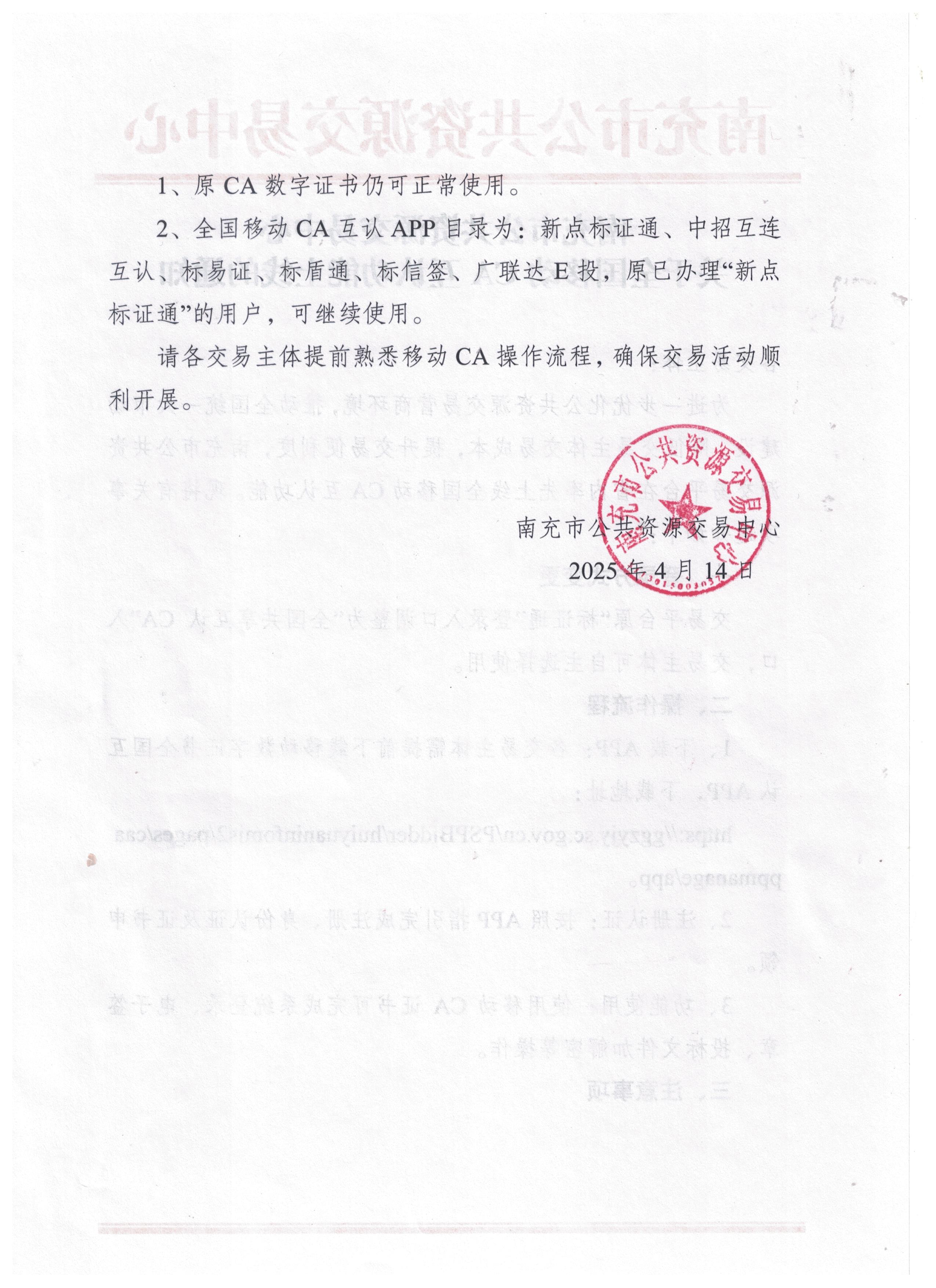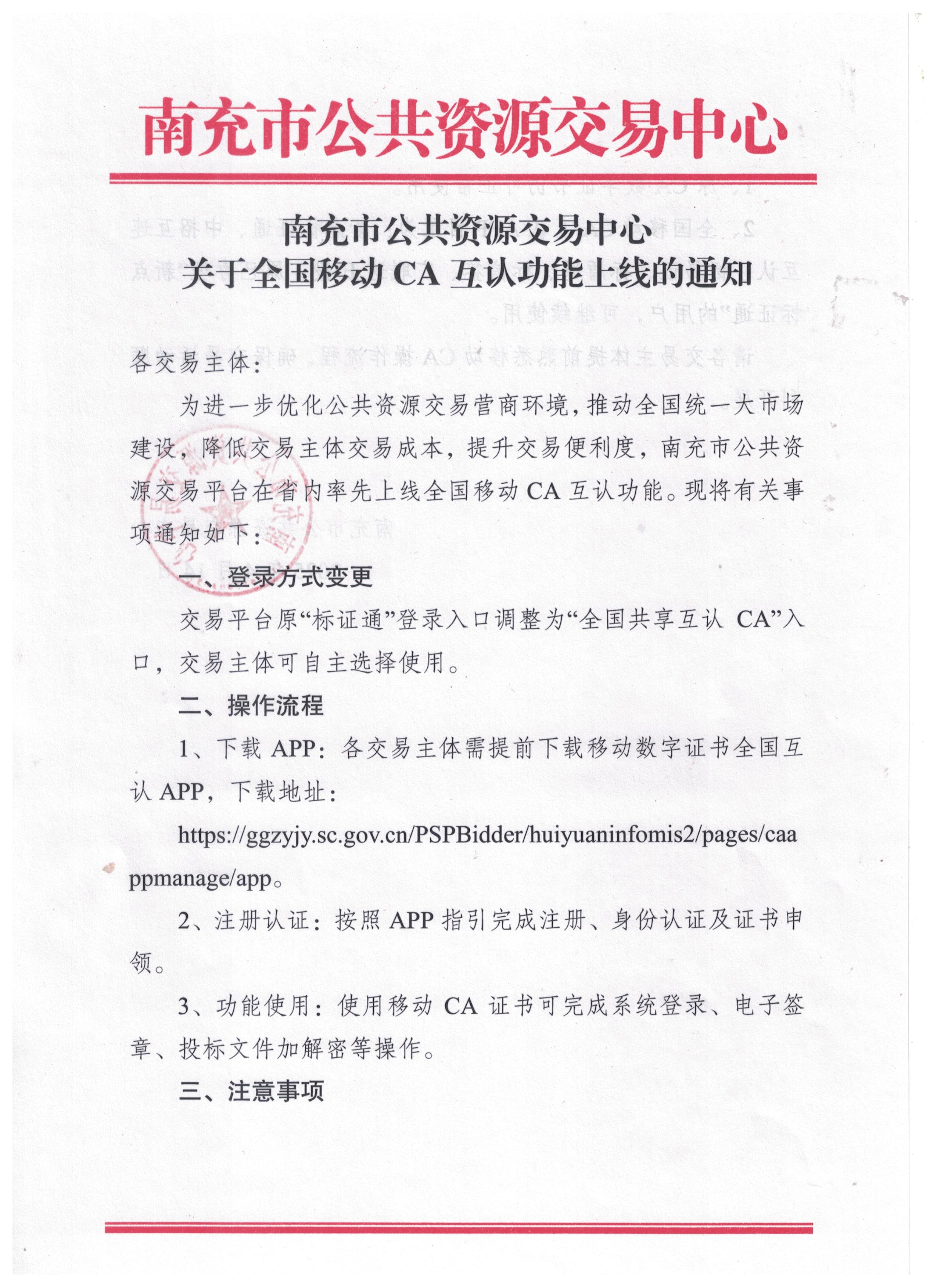 為進(jìn)一步優(yōu)化公共資源交易營(yíng)商環(huán)境,推動(dòng)全國(guó)統(tǒng)一大市場(chǎng)建設(shè),降低交易主體交易成本,提升交易便利度,南充市公共資源交易平臺(tái)在省內(nèi)率先上線全國(guó)移動(dòng)CA互認(rèn)功能?,F(xiàn)將有關(guān)事項(xiàng)通知如下: